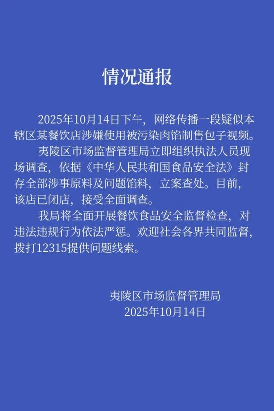 针对媒体报道的“湖北一早餐店用猫啃食过的肉馅做包子”一事,10月14日湖北省宜昌市夷陵区市场监督管理局通报称,执法人员封存了全部涉事原料及问题馅料,立案查处。