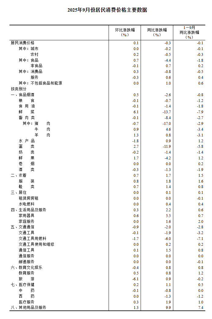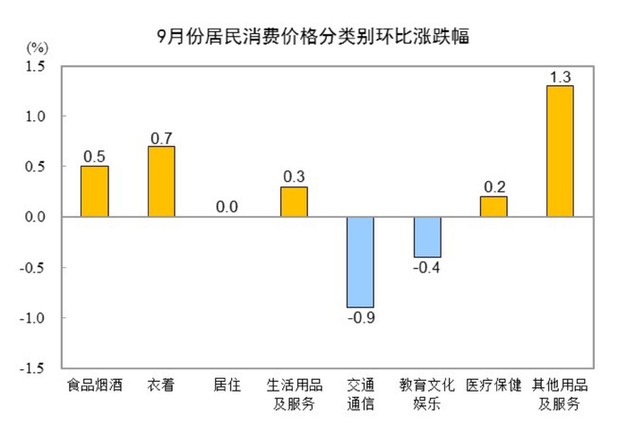 9月份,全国居民消费价格环比上涨0.1%。其中,城市持平,农村上涨0.2%;食品价格上涨0.7%,非食品价格下降0.1%;消费品价格上涨0.3%,服务价格下降0.3%。