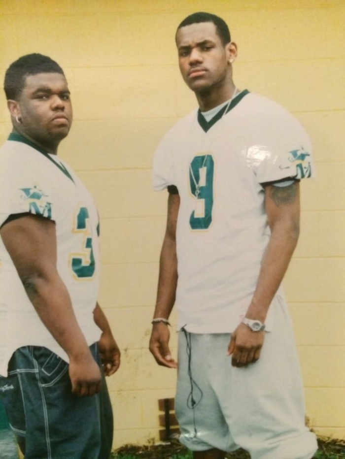 詹姆斯转发了媒体rare_sports发布的他和高中队友Sian Cotton身穿圣文森特圣玛丽高中橄榄球队球衣的合照。