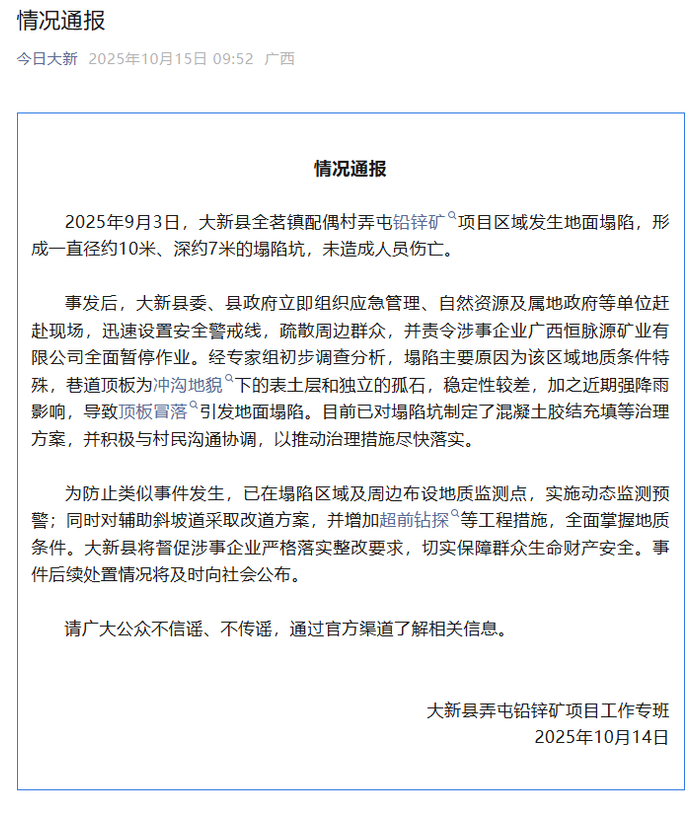 为防止类似事件发生,已在塌陷区域及周边布设地质监测点,实施动态监测预警;同时对辅助斜坡道采取改道方案,并增加超前钻探等工程措施,全面掌握地质条件。大新县将督促涉事企业严格落实整改要求,切实保障群众生命财产安全。事件后续处置情况将及时向社会公布。