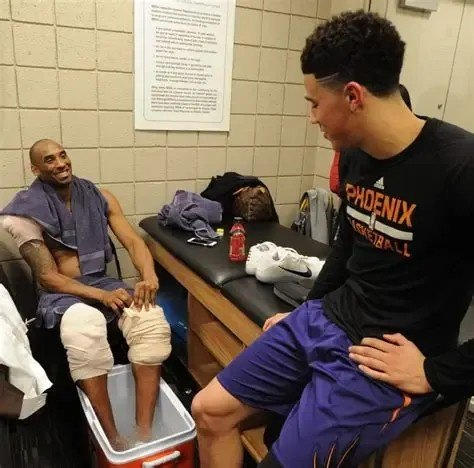 九年前他俩初遇时,布克在比赛中对科比用过科比的招式,当时科比一笑;之后科比告诉布克,“继续努力,永远不要在这个联盟中停下来!……你有步伐,基本功完整,有成为传奇的资质!”