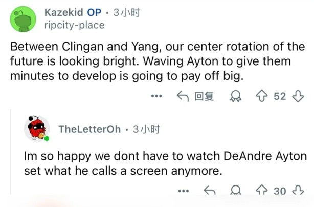 网友:在克林根和杨瀚森之间,我们的未来中锋轮换真是前景光明。裁掉艾顿,让他们有更多时间成长,这个决定迟早会有大回报。