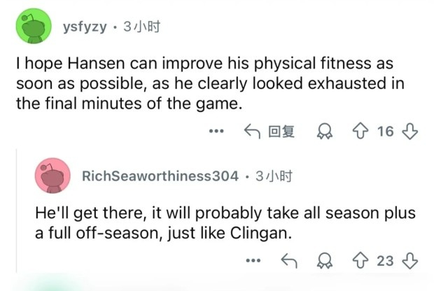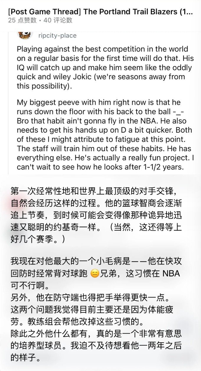 网友:他会慢慢跟上的,大概需要一整个赛季再加上一个完整的休赛期,就像克林根那样。