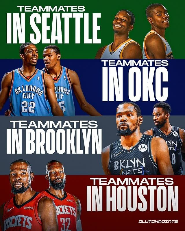 超音速、雷霆、篮网、火箭 KD和杰夫-格林4次成为队友