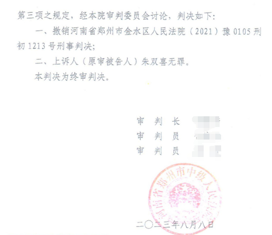 2021年7月,朱双喜因“寻衅滋事罪”被判处有期徒刑4年。他当庭表示要上诉。2022年11月,他被以“寻衅滋事罪”判处有期徒刑1年6个月,此前认定的1300余万元“涉案赃款”被调整至84万元。他依旧不服。直到2023年8月8日,朱双喜被郑州中院判决无罪。