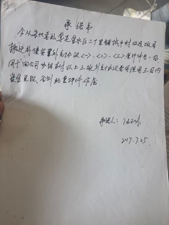 一周后,开发商还专门向朱双喜出具了《承诺书》,申明协议是自愿签订。又过了一天,开发商想找朱双喜要一份协议复印件,朱双喜还是不放心,对方又手写了一份承诺书:“今从朱双喜处拿走金水区二十里铺城中村改造项目搬迁补偿安置补充协议复印件各一份”“三日内资金兑现,否则此复印件作废”。当天和次日,朱双喜分两次收到了全部的赔偿款。