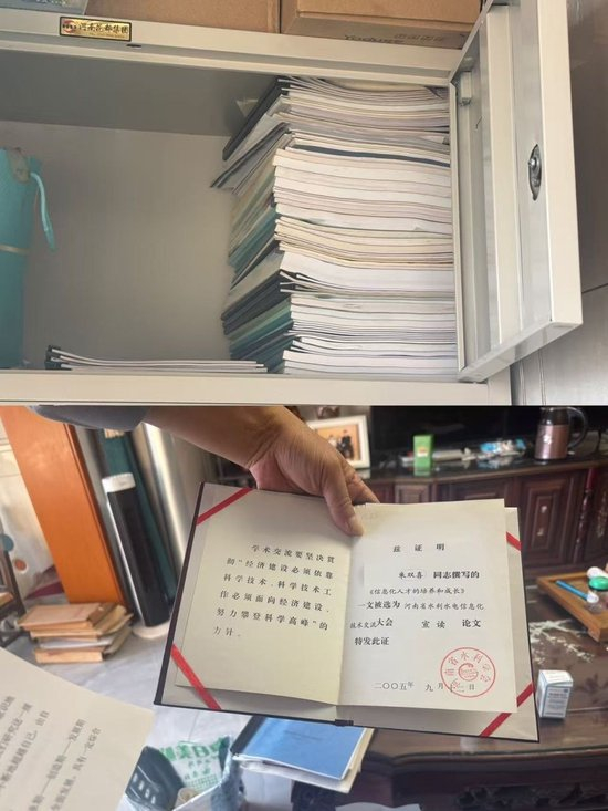 变故还导致他错过评高级工程师职称。当年朱双喜准备评职称的一摞材料仍整齐摆放在阳台书柜里,每一篇论文、每一本报告里都有他的署名,都是他深耕业务的成果证明,如今都成了“没用了”的纸张。
