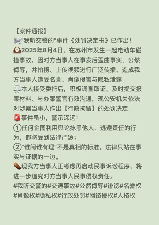 男子的委托律师表示,2025年8月4日,在苏州市发生一起电动车碰撞事故,因对方当事人在事发后歪曲事实、公然侮辱,并拍摄、上传视频进行广泛传播,造成我方当事人遭受名誉、肖像侵害与隐私泄露。