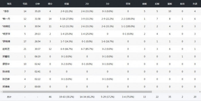 球队方面,全队外线始终打不开局面,三分球29投仅5中,命中率17.2%;且进攻端有些急躁,全场出现20次失误;整场厦门女篮仅2次助攻。球员方面,赖一丹拿到全队最高14分另有8篮板,但18投仅5中效率不高;赵莉芝内线终结效率在线,拿下12分6篮板;肖婉钰也拿到11分4篮板;另外李彤和杨梦萍虽然得分不多,但拼抢篮板很是积极,分别拼下10篮板(5前场篮板)、6篮板。