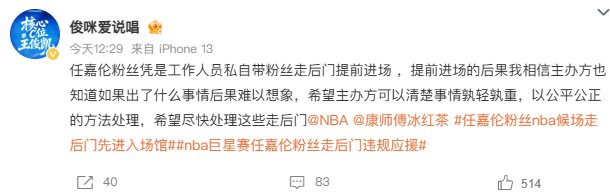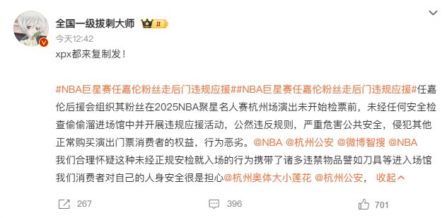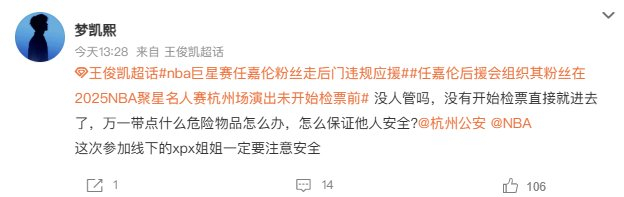 根据微博相关热搜词条可以看到,嘉宾任嘉伦的应援粉丝团,被举报存在逃票、无票进入、越过安检、走后门违规应援的情况,同时还爆出部分人员引导粉丝进行其他过激的违规应援行为,存在影响活动现场秩序的风险。
