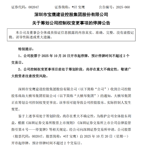 *ST宝鹰表示,鉴于上述事项处于筹划阶段,尚存在重大不确定性,为维护公司全体股东利益,根据相关规定,经公司向深圳证券交易所申请,公司股票自2025年10月20日(星期一)开市起停牌,预计停牌时间不超过2个交易日。