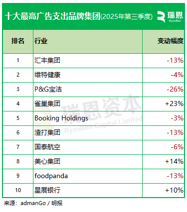 排名第一的汇丰集团(00005.HK),广告开支按年下跌13%;