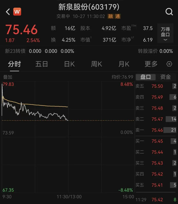 截至10月27日午间收盘,新泉股份股价报75.46元/股,总市值为371亿元。