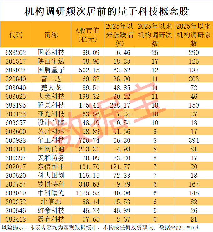 据证券时报·数据宝统计,今年以来量子科技概念股合计获得313次机构调研。国芯科技、陕西华达、国盾量子、富士达、楚天龙、大豪科技6只概念股调研频次在11次及以上,相当于月均至少调研1次