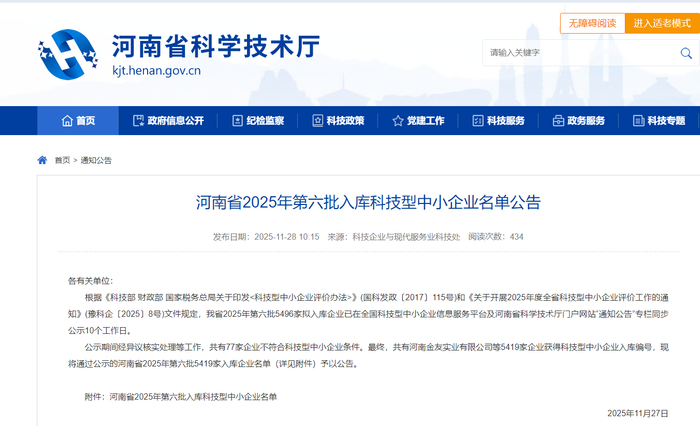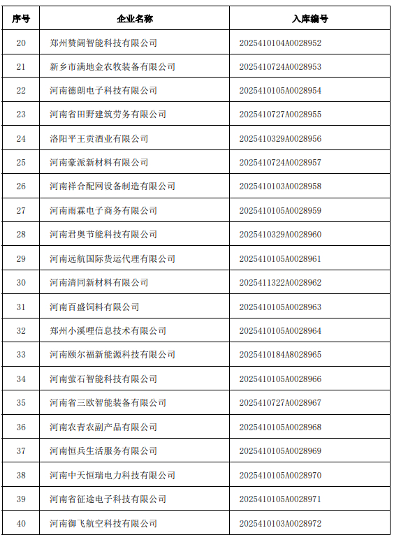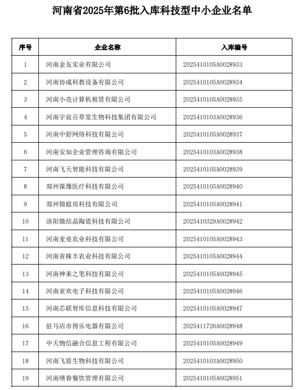 11月28日,记者从河南省科技厅获悉,河南省2025年第六批入库科技型中小企业名单公布。