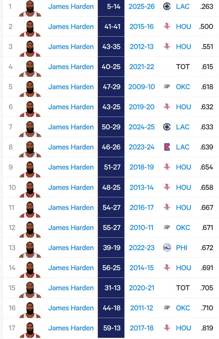 本赛季在哈登出战的比赛中,快船战绩是5胜14负,26.3%的胜率创下了哈登个人生涯新低。