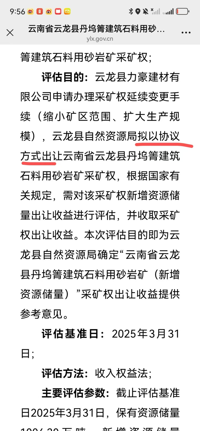 14天后,云龙县人民政府官网发布的《云南省云龙县丹坞箐建筑石料用砂岩矿(新增资源储量)采矿权出让收益评估报告摘要》载明,力豪建材公司申请办理采矿权延续变更手续,云龙县自然资源局拟以协议方式出让丹坞箐建筑石料用砂岩矿采矿权。