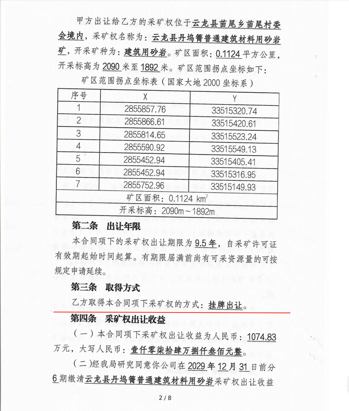 2025年7月15日,云龙县自然资源局与力豪建材公司签订《采矿权出让合同书》,以“协议出让”方式向其新增1084.73万吨资源储量。约定本合同项下的采矿权出让期限为9.5年,力豪建材公司取得本合同项下采矿权的方式为挂牌出让。8月25日,力豪建材公司取得了该矿的采矿许可证。