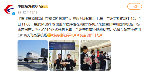 央视网消息:12月1日11:08,东航MU9179航班平稳降落在海拔1948.7米的兰州中川国际机场,标志着国产大飞机C919正式开启上海—兰州定期商业航班运营。这是东航首次使用C919执飞高原机场。