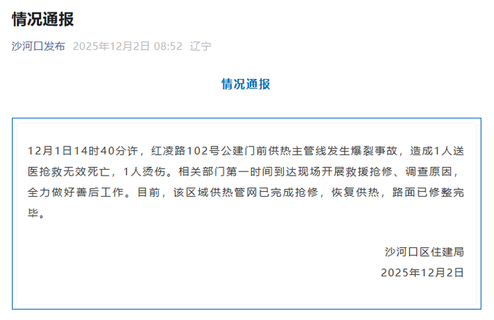 央视网消息:辽宁大连沙河口区住建局12月2日通报:12月1日14时40分许,红凌路102号公建门前供热主管线发生爆裂事故,造成1人送医抢救无效死亡,1人烫伤。相关部门第一时间到达现场开展救援抢修,全力做好善后工作。目前,该区域供热管网已完成抢修,恢复供热,路面已修整完毕。事故原因正在调查中。
