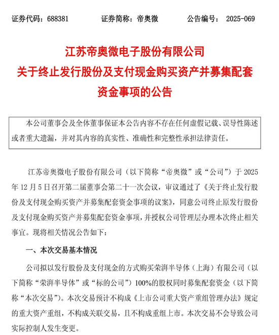 12月5日晚,帝奥微(688381)发布公告称,公司决定终止发行股份及支付现金购买荣湃半导体(上海)有限公司100%股权并募集配套资金事项。