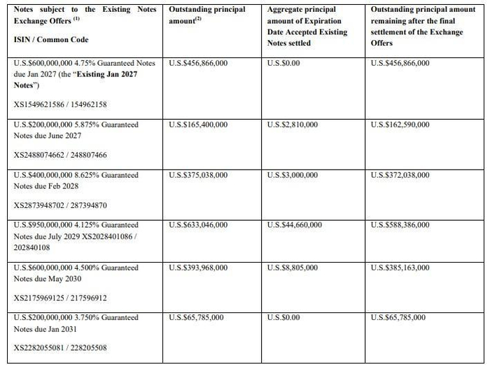 (b) 继交换要约最终结算后,BondCo于 2025 年 12 月 5 日交换了本金总额为 59,275,000 美元的现有票据,并将根据相关现有票据的条款及条件予以注销。有关各系列现有票据的已交换本金金额及剩余未偿还本金金额的详情载列如下。