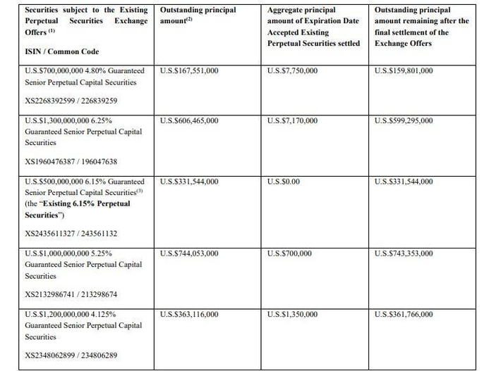 (a) 根据交换要约,本金总额为 2,292,955,000 美元的未偿还现有永续证券及本金总额为 235,974,000 美元的未偿还现有票据已被交换并将予注销;及