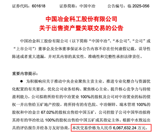 据披露,公司拟将所持有的中冶置业100%股权及对中冶置业的标的债权一并出售给五矿地产控股,将所持有的有色院、中冶铜锌、瑞木管理 100%的股权和中冶金吉67.02%的股权出售给中国五矿,公司控股子公司中国华冶拟将其持有的华冶杜达100%的股权出售给中国五矿或其指定主体。根据评估报告并经各方友好协商,本次交易价格为606.76亿元。