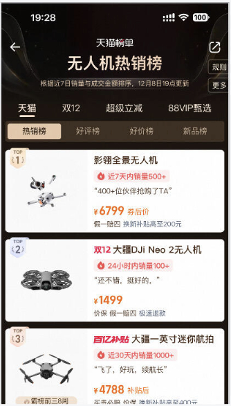 为强化信心,他晒出了天猫无人机热销榜截图:售价6799元的影翎位列榜首,其后为1499元的大疆DJi Neo 2无人机与4788元的大疆一英寸迷你航拍机。