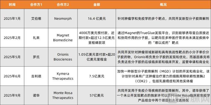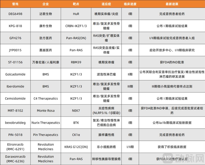 在对已知分子胶系统的深入探索中,聚焦化合物库则充分利用现有分子胶结构知识进行靶向设计。例如,针对E3连接酶cereblon(CRBN)的免疫调节药物(IMiDs)化合物库便是典型案例。通过对CRBN蛋白互作区域进行系统性化学修饰,药明康德构建了约600万个精炼化合物,这些化合物基于现有分子胶结构知识进行针对性设计与优化,显著提高了发现高亲和力、高特异性分子胶的概率,提升了对具有明确构效关系靶点的筛选效率。除双轨战略外,多技术融合成为分子胶研发中不可或缺的环节,构建起从“线索发现”到“候选物优化”的完整技术闭环。亲和筛选质谱(ASMS)作为一种无标记筛选技术,通过对比分子在单蛋白与双蛋白环境下的质谱信号差异,精准识别出能够促进蛋白-蛋白相互作用的潜在分子胶候选物,在海量化合物中筛选出具有潜在价值的分子胶。高通量筛选(HTS)技术以“一孔一化合物”的自动化运行模式,结合蛋白结合能力或降解能力等功能性实验,能够快速筛选出具有生物活性的候选分子,极大地提高了筛选效率与准确性,确保只有最具潜力的分子进入后续优化环节。结构生物学则通过解析蛋白-分子胶复合物的三维结构,为分子胶的优化提供关键的结构信息,助力科研人员深入理解分子胶与蛋白之间的相互作用模式,从而有针对性地对分子胶进行结构优化,为分子胶的性能提升提供了重要依据。这些技术的深度融合,标志着分子胶研发进入“多维度协同”的工程化发展阶段。在这一阶段,各项技术相互协作、优势互补,共同推动分子胶从实验室基础研究向临床应用转化,为分子胶药物的研发与应用奠定了坚实的技术基础。03 分子胶让癌症患者6个月生存率达100%在2025年众多分子胶新药研发中,海内外企业均在不同靶点、不同疾病领域取得了突破性进展,其临床数据与作用机制为分子胶疗法的潜力提供了有力证据。在海外,Pin Therapeutics、Revolution Medicines、Monte Rosa Therapeutics、C4 Therapeutics等分子胶明星企业,均在今年取得了积极进展。以Revolution Medicines的Elironrasib(RMC-6291)与Daraxonrasib(RMC-6236)为例。6月,Revolution Medicines宣布,FDA授予靶向RAS(ON)多选择性抑制剂的新药Daraxonrasib(RMC-6236)用于治疗携带KRAS G12突变的经治胰腺癌BTD(突破性药物资格)。该BTD基于Daraxonrasib在PDAC(胰腺导管腺癌)患者中观察到的积极早期临床证据:中位无进展生存期(PFS)达8.8个月(远超传统化疗的3-5个月);6个月生存率高达100%(对照组仅约60%);客观缓解率(ORR)36%(部分患者肿瘤明显缩小);安全性良好,未出现严重不良反应。目前RMC-6236 3期临床研究正在开展中,预计2026年完成入组。Elironrasib(RMC-6291)则是Revolution Medicines研发的RAS(ON)G12C选择性抑制剂,属于非降解型分子胶。10月,Revolution Medicines宣布,elironrasib在既往接受过KRAS(OFF)G12C抑制剂治疗的KRAS G12C突变型非小细胞肺癌(NSCLC)患者中,获得了积极临床数据:客观缓解率(ORR)达42%,疾病控制率(DCR)为79%,中位缓解持续时间为11.2个月,中位无进展生存期(mPFS)为6.2个月,12个月总生存率为62%。目前,elironrasib正在探索与免疫疗法(如帕博利珠单抗)、其他靶向药(如SHP2抑制剂)的联合方案,以进一步提升疗效,并同步计划推进至2期、3期临床试验,验证其在一线治疗及更多瘤种中的应用价值。在国内,亦有不少创新药企近期在分子胶领域取得了突破性进展。例如,12月,达歌生物宣布公司全球首个针对first-in-class靶点HuR(Human antigen R)的分子胶降解剂DEG6498,已于11月25日在中国完成首位临床试验受试者给药。HuR是一种RNA结合蛋白,在癌症、炎症和代谢等疾病的进程中发挥着关键性的作用,此前被业界认为是无法成药的靶点。达歌生物凭借其自主建立的特异性分子胶药物发现平台与创新技术,成功攻克了这一难题。DEG6498是一种强效、口服生物利用度高的分子胶降解剂小分子药物,能诱导E3泛素连接酶Cereblon(CRBN)与HuR的相互作用,从而促进HuR蛋白的靶向降解。作为全球第一款靶向HuR的分子胶降解剂,DEG6498有望满足多个适应症领域尚未被满足的迫切医疗需求。11月,康朴生物公布分子胶降解剂epaldeudomide (KPG-818) 用于治疗血液肿瘤的I期临床试验结果。KPG-818归属E3泛素连接酶复合物CRL4-CRBN调节剂,对靶点CRBN具有高亲和力。在既往接受过两个度胺类药物、至少一种蛋白酶抑制剂及一种抗CD38单抗的难治或复发多发性骨髓瘤患者中,KPG-818与地塞米松联用,客观缓解率(ORR)为50%,疾病控制率(DCR)为94%。它通过高效降解锌指转录因子Aiolos(IKZF3)和Ikaros(IKZF1),发挥广谱免疫调节、抗血管生成和抗肿瘤作用。此外,今年还有劲方医药、嘉越医药、万春宏基、人福利康等中国药企,均在分子胶领域取得了良好进展。海外内药企不约而同布局分子胶管线,是由于分子胶赛道技术壁垒高,竞争相对较小,且正从肿瘤向更广阔的疾病领域渗透。更重要的是,在分子胶领域,目前仅有沙利度胺、来那度胺和泊马度胺这三款药物走向了商业化道路。高技术壁垒+市场存在大量空白,为我国初创药企提供了与国际明星药企同台竞技的舞台,也为具备创新能力的国内药企提供了弯道超车的战略窗口。未来,随着临床试验数据不断涌现,一些具有潜力的国产分子胶管线有望脱颖而出,为我国药企在全球市场赢得更多的话语权。04 未来展望:分子胶的下一个十年挑战何在?尽管分子胶在2025年取得了令人瞩目的进展,但在未来的发展道路上,仍面临