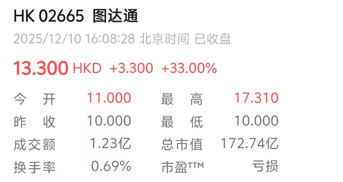 截至午间收市,图达通每股收报13.30港元,涨33%,总市值172.74亿港元