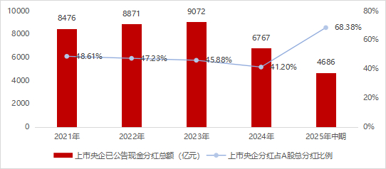 政策效果在上市央企的分红数据中得到直接体现。2025年中期,477家上市央企虽然数量仅占A股总量的8.7%,但累计公告现金分红达4686亿元,同比增长7%,占同期A股市场分红总额的比重超过68%。这不仅反映出央企分红规模的提升,也凸显其在A股整体分红结构中的重要地位与持续贡献。