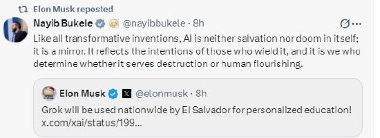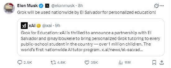 马斯克在X上发帖称:“Grok将在萨尔瓦多全国范围内用于个性化教育!”