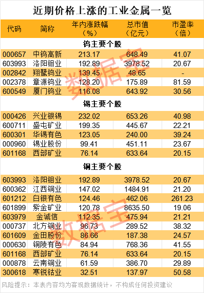 工业金属中,铜、锡、钨等价格涨势明显。其中,钨价涨势最为惊人,以江西仲钨酸铵(85%)为例,价格从年初的21万元/吨,一路飙升至最新的68万元/吨,涨幅达到220%。