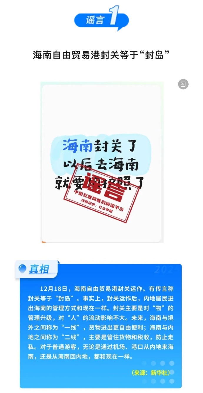 海南自由贸易港封关等于“封岛”、激素蛋大量流入市场、一次性信用修复等于“信用洗白”……这些谣言别再传了。中国互联网联合辟谣平台盘点2025年12月热传谣言,遏制谣言传播空间,净化网络生态,营造风清气正的网络环境。详情↓↓