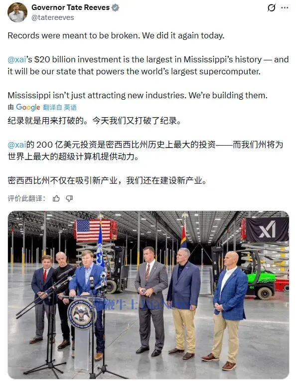 xAI显然正在全力冲刺:它在田纳西州孟菲斯建了一个叫“Colossus”的超算中心;最近又在密西西比州南黑文砸下200亿美元,正在建设一个代号“Macrohard”的数据中心集群。
