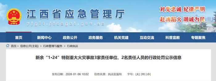 据中国应急管理官微消息,近日,江西省应急管理厅公示了新余“1·24”特别重大火灾事故相关责任单位及责任人行政处罚信息。
