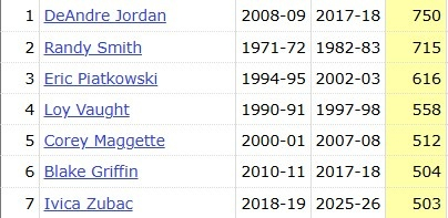 本场过后,祖巴茨快船生涯出场数来到504场,追平格里芬,并列队史第6。