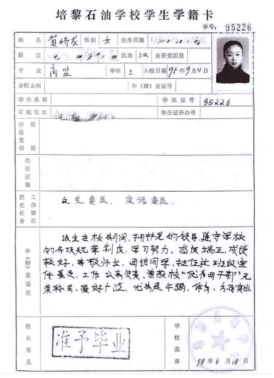 文章称,贺娇龙是该校1998届商品质量监督专业毕业生、优秀校友。1998年夏,贺娇龙从原培黎石油学校(现兰州城市学院)毕业。学号95226——这个印在泛黄学籍卡上的数字,至今仍静静地躺在母校的档案里,连着她永远留在这里的青春。