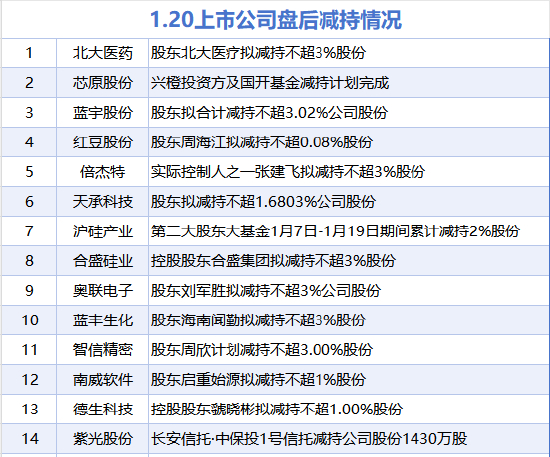据统计,1月20日,盘后包括暂无A股上市公司披露增持情况。包括北大医药、芯原股份、蓝宇股份、红豆股份、倍杰特、天承科技、沪硅产业、合盛硅业、奥联电子、蓝丰生化、智信精密、南威软件、德生科技、紫光股份在内的14家A股上市公司披露减持情况。