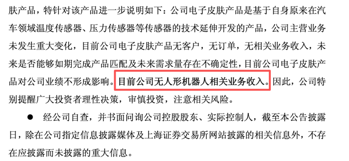 日盈电子针对该产品进一步说明:公司电子皮肤产品是基于自身原来在汽车领域温度传感器、压力传感器等传感器的技术延伸开发的产品,公司主营业务未发生重大变化,目前公司电子皮肤产品无客户,无订单,无相关业务收入,未来是否能够如期完成产品匹配及未来需求量存在不确定性,目前公司电子皮肤产品对公司业绩不形成影响。目前公司无人形机器人相关业务收入。