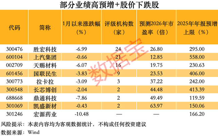 A股进入业绩预告披露高峰期,高预增股票股价表现亮眼,比如佰维存储、大族数控、金海通等,近期股价均创出历史新高。不过,也有些业绩向好公司股价下跌。据数据宝统计,根据业绩预告,有9只年内股价下跌的个股去年年报预增且增幅上限超过100%。