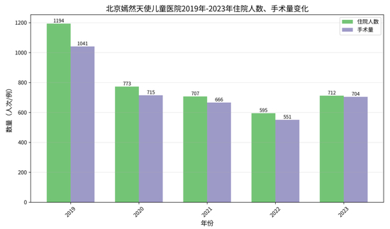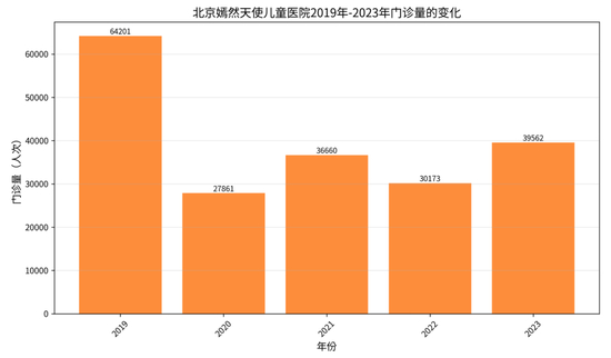 从业务数据看,嫣然医院曾在2019年达到阶段性的高峰。医院年度报告显示,当年门诊量超过6.4万人次,住院患者1194人,完成唇腭裂手术1041台。但疫情后,2020年门诊量骤降58%,此后虽逐步回升,但截至2023年,门诊量也只是回升到了3.9万人次,尚未回到2019年的水平。