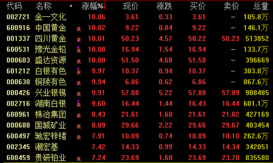 有色板块盘中强势拉升,钴、镍、黄金概念等表现亮眼。截至收盘,四川黄金尾盘涨停创历史新高,白银有色斩获4连板,中国黄金、豫光金铅、盛达资源等均涨停。