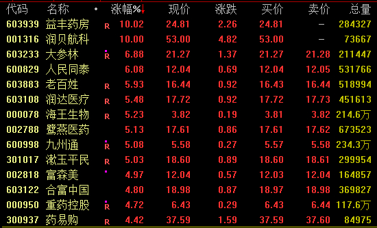 药店零售股盘中集体走高,截至收盘,益丰药房涨停,大参林、人民同泰涨超6%,老百姓、海王生物等涨逾5%。
