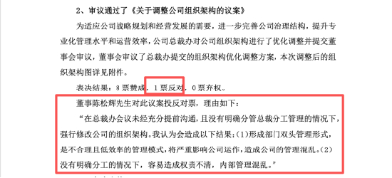 分歧最早在2024年12月显现。第五届董事会第十四次会议上,董事陈松辉在《关于调整公司组织架构的议案》中投出反对票,认为在缺乏充分沟通、分工尚未明确的情况下调整组织架构,可能对内部管理产生影响。这一反对意见,成为创始团队在公开文件中首次出现不同立场的记录。