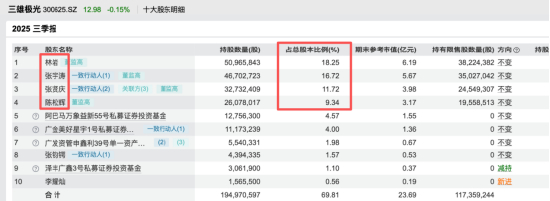 截至2025年9月末,四位创始人的持股比例分别为18.25%、16.72%、11.72%和9.34%。