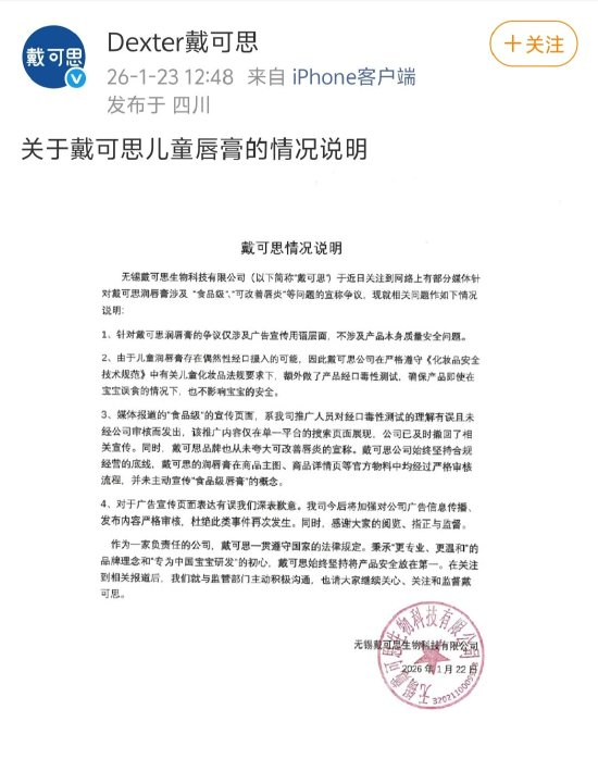 今日,戴可思在社交平台就此事发布声明。戴可思表示,针对戴可思润唇膏的争议仅涉及广告宣传用语层面,不涉及产品本身质量安全问题。