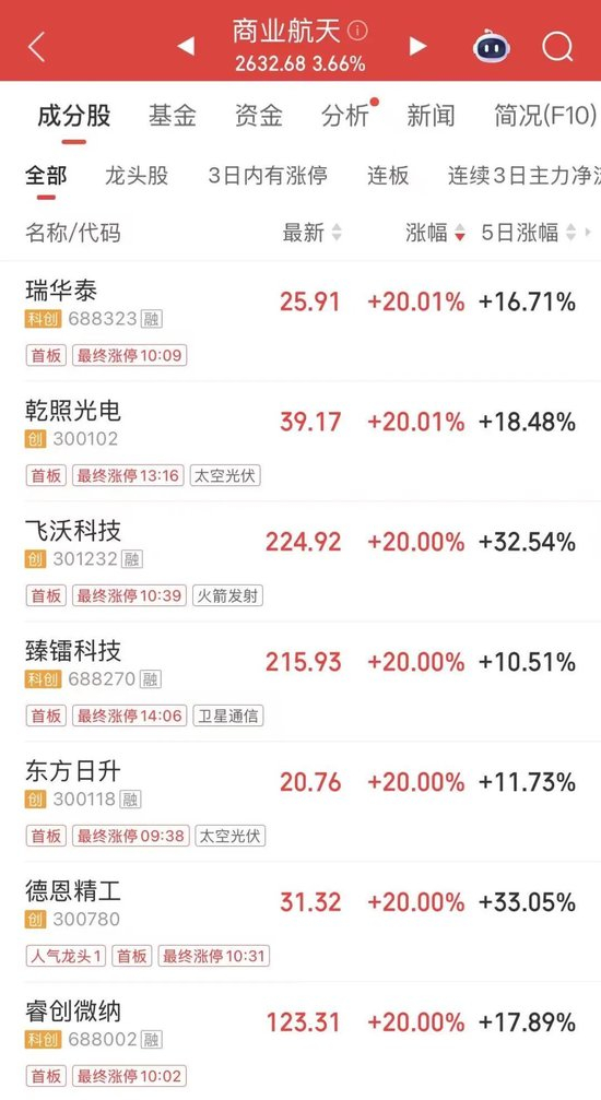 今日,商业航天概念大涨,金风科技、润贝航科、西部材料等多只成分股涨停。