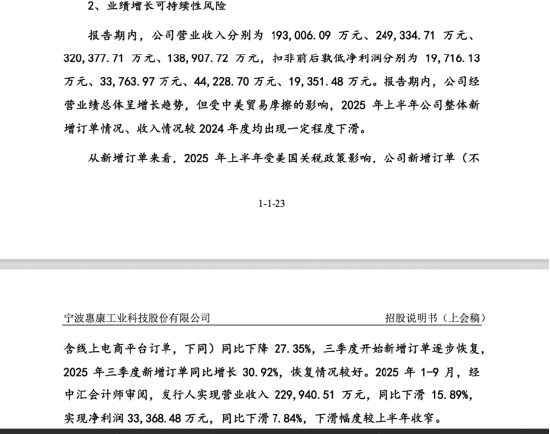 时间回到2025年6月,惠康科技IPO申请获受理时,其财务表现仍保持着高成长态势。不过,随着审核推进,业绩走势出现变化。公司在招股材料中披露,受中美贸易摩擦等外部环境变化影响,2025年上半年整体新增订单及收入情况较2024年度出现一定程度下滑,进而对当期经营业绩形成压力。